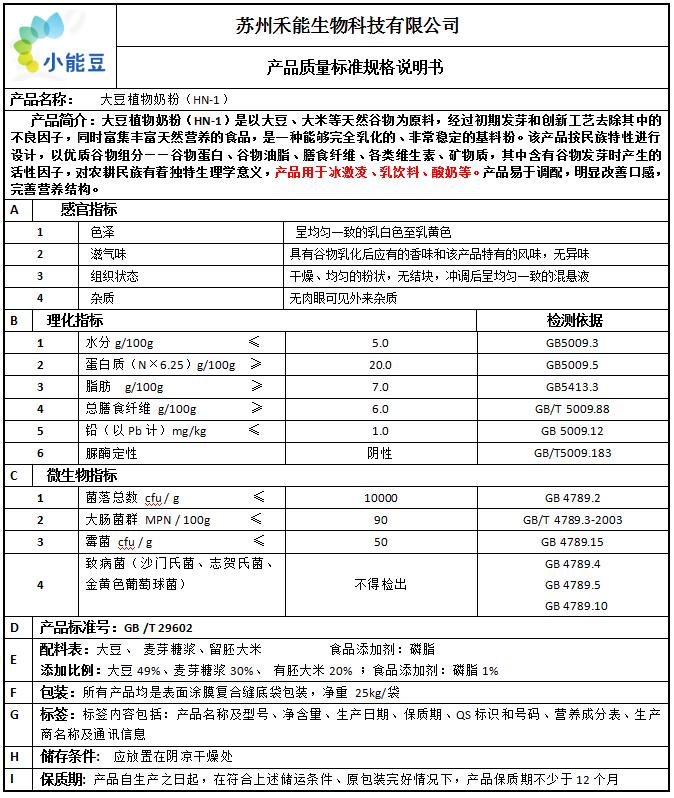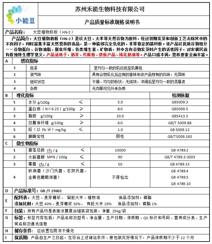 公司主要产品——大豆植物奶粉 分2个型号:蛋白型(HN-1)和油脂型(HN-2)
